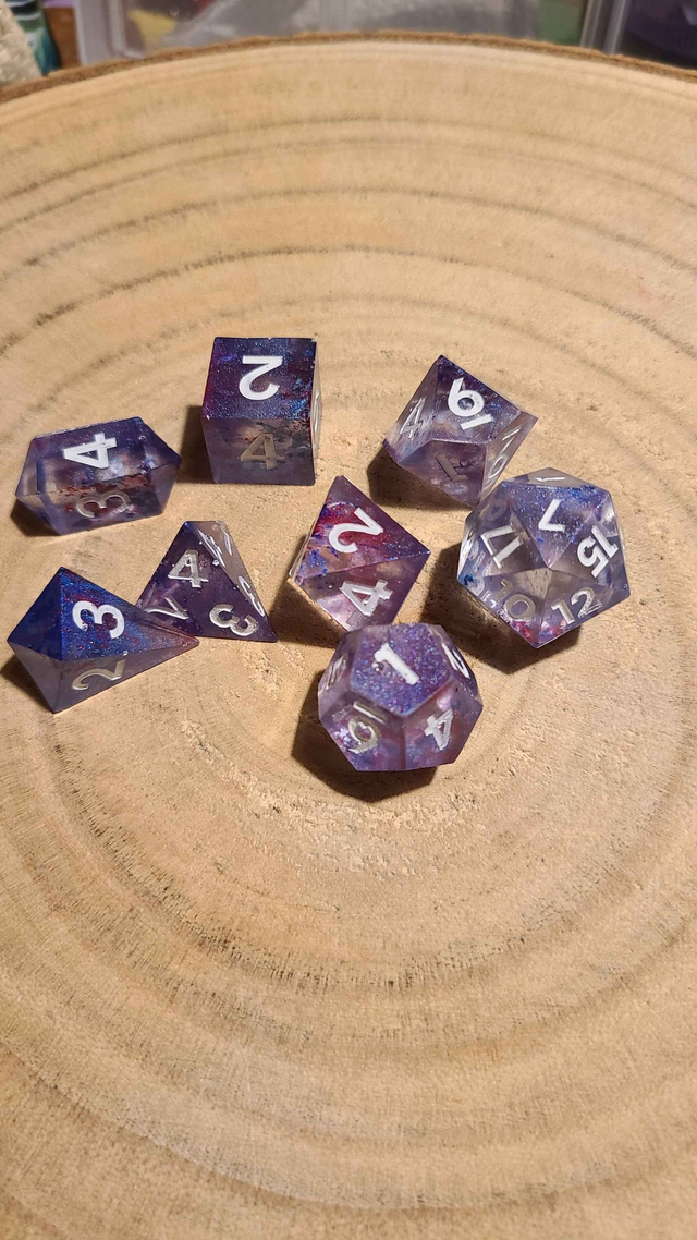 Dés en résine moulés, décorés puis peints à la main par Coco dans notre atelier.